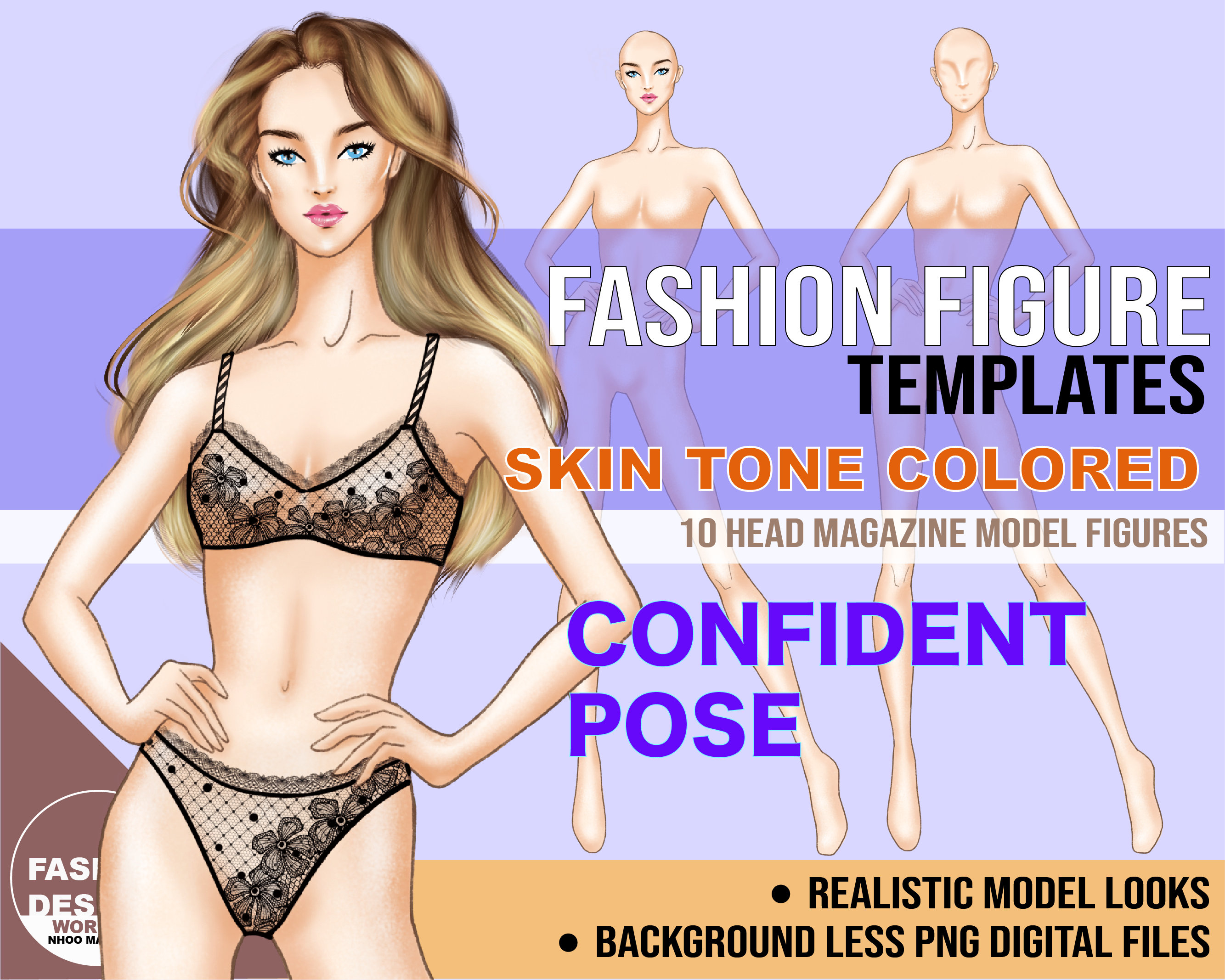 Light Skin Tone Colored Confident Runway Pose 3 Realistic Fashion Figure Croqui Templates Background Less Png 10 Head Model Figures Etsy Hong Kong